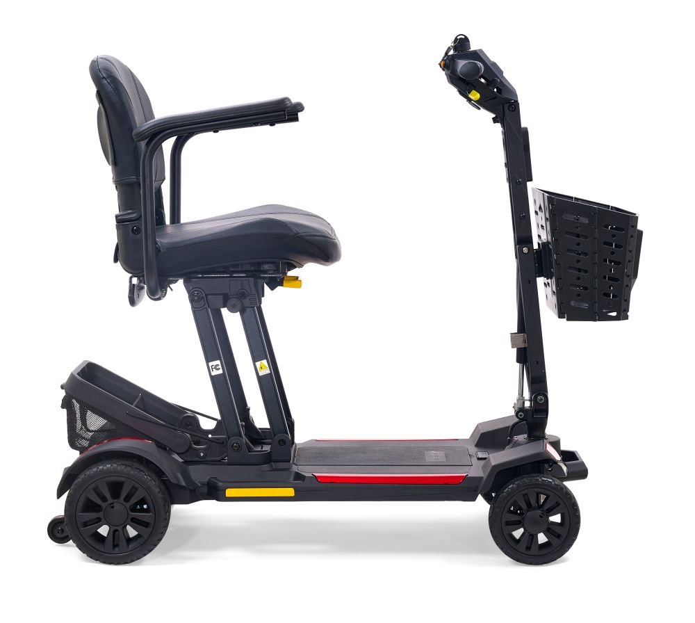 The Buzzaround CarryOn foldable scooter is small in stature and big on fun! This new sporty, super portable scooter will take you where you want to go in comfort and style! It features an infinitely adjustable tiller, full front and rear lighting package, 2 lithium-ion battery packs, included bottle and cane holders, and 300 lb. weight capacity. The heaviest piece is 47.5 lbs. (without seat and batteries) and the height when folded is only 12". This lightweight, folding mobility scooter disassembles easily into a few pieces and is designed to store in the smallest compartments. Pack your dreams and go anywhere with the CarryOn travel scooter!